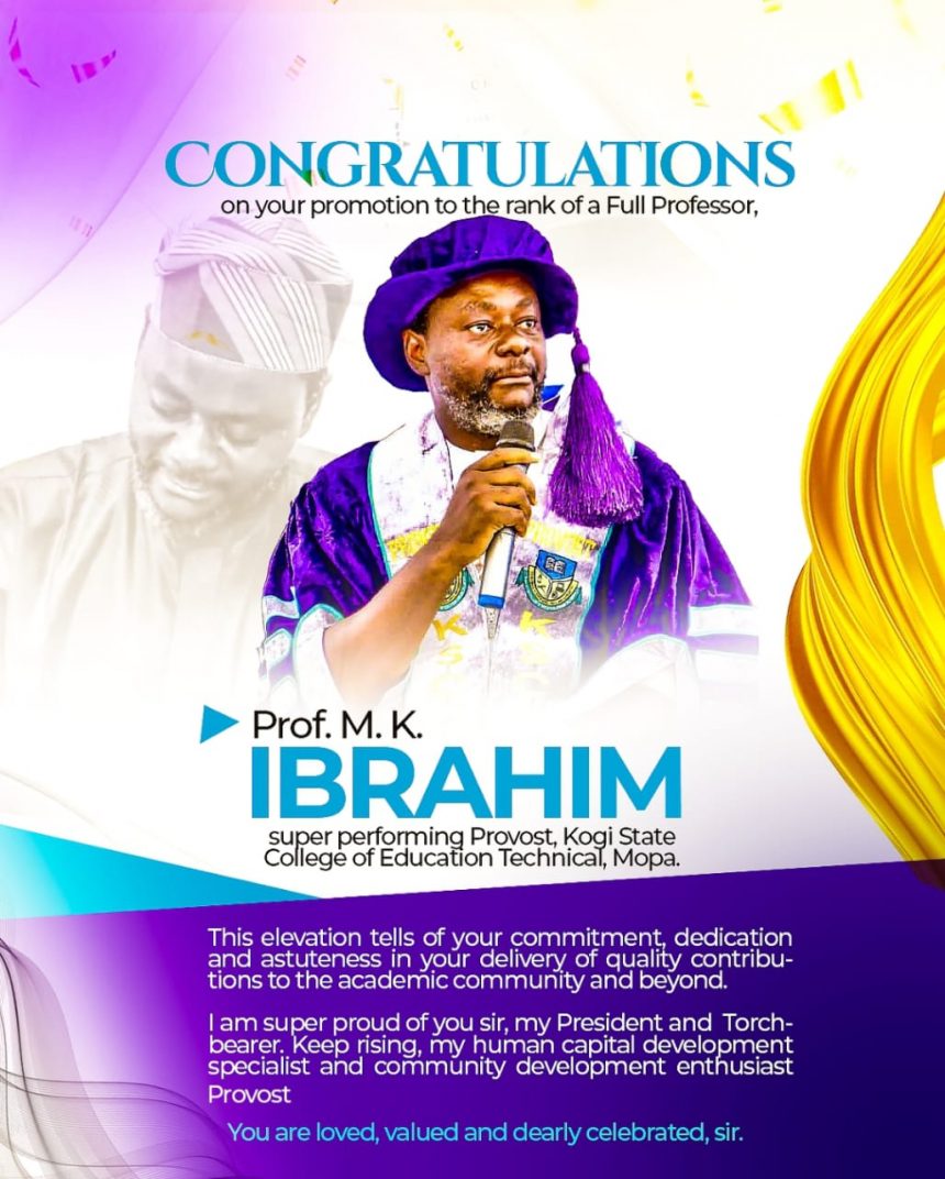 Congratulations on your promotion to the rank of a Full Professor, Prof. M. K. Ibrahim, super performing Provost, Kogi State College of Education Technical, Mopa.