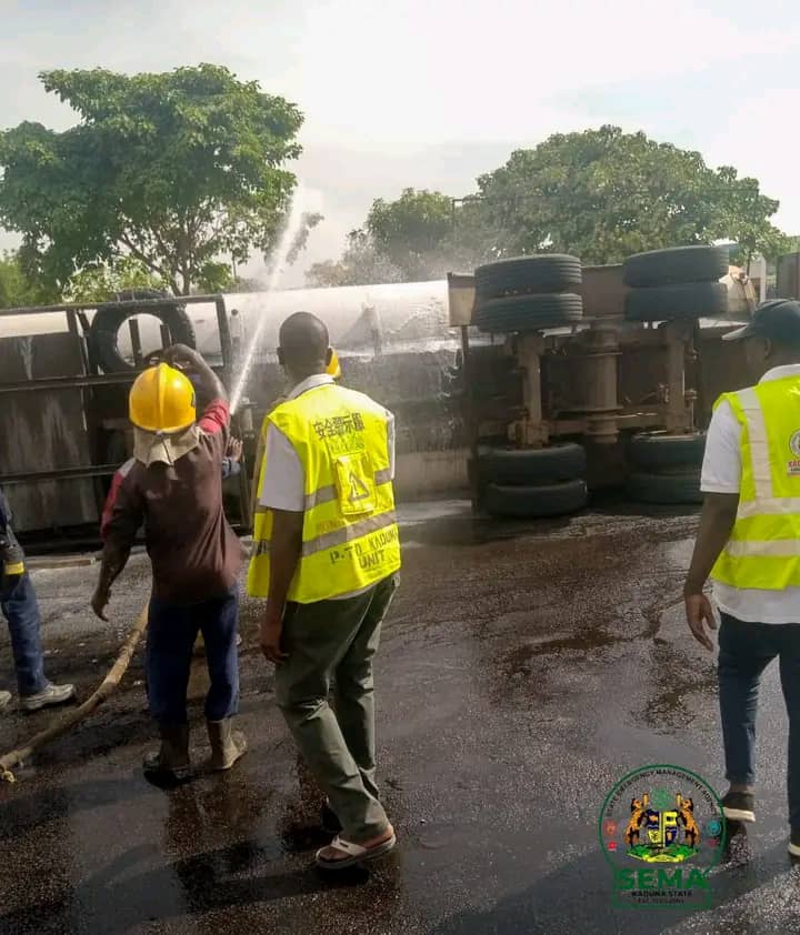 A fuel tanker conveying approximately 50,000 litres of petrol overturned on Sunday at the NEPA Roundabout in Kaduna metropolis, resulting in a tragic incident that claimed two lives.