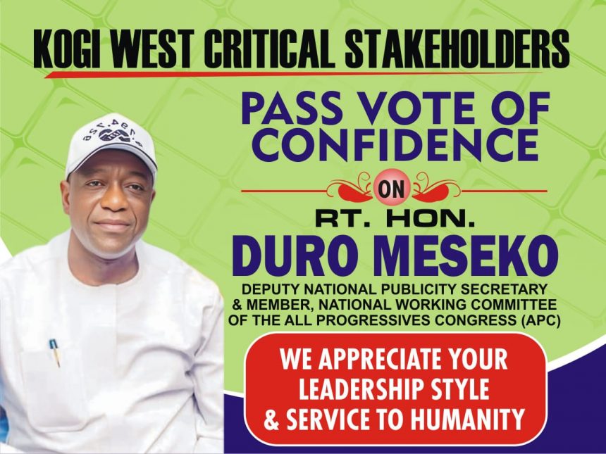 A socio-political group, Kogi West Critical Stakeholders has passed a vote of confidence on Rt. Hon. Duro Meseko, the Deputy National Publicity Secretary and Member, National Working Committee (NWC) of the All Progressives Congress (APC), ahead of the National, States and Local Governments Congress of the party.