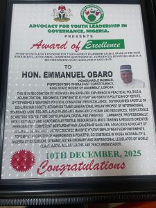 Lokoja – Hon. (Dr.) Emmanuel Obaro, member representing Yagba East State constituency at the Kogi State House of Assembly, has been awarded the Best Performing State Legislator in Kogi State by Advocacy for Youth Leadership in Governance Nigeria for the year 2025