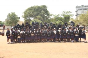 As part of the outreach initiative, backpacks with care packages containing sanitary pads, hygiene kits, and educational materials were distributed to all the female students to support their health and well-being.