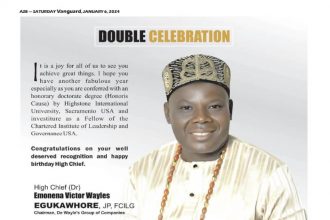 HON FRED AGBEDI MEMBER HOUSE OF REPS SAGBAMA/ EKEREMOR FED CONSTITUENCY CONGRATULSTES High Chief( Dr) Emonena Victor Wayles Egukawhore JP, FCILG , Chairman De Wayles Group of Companies