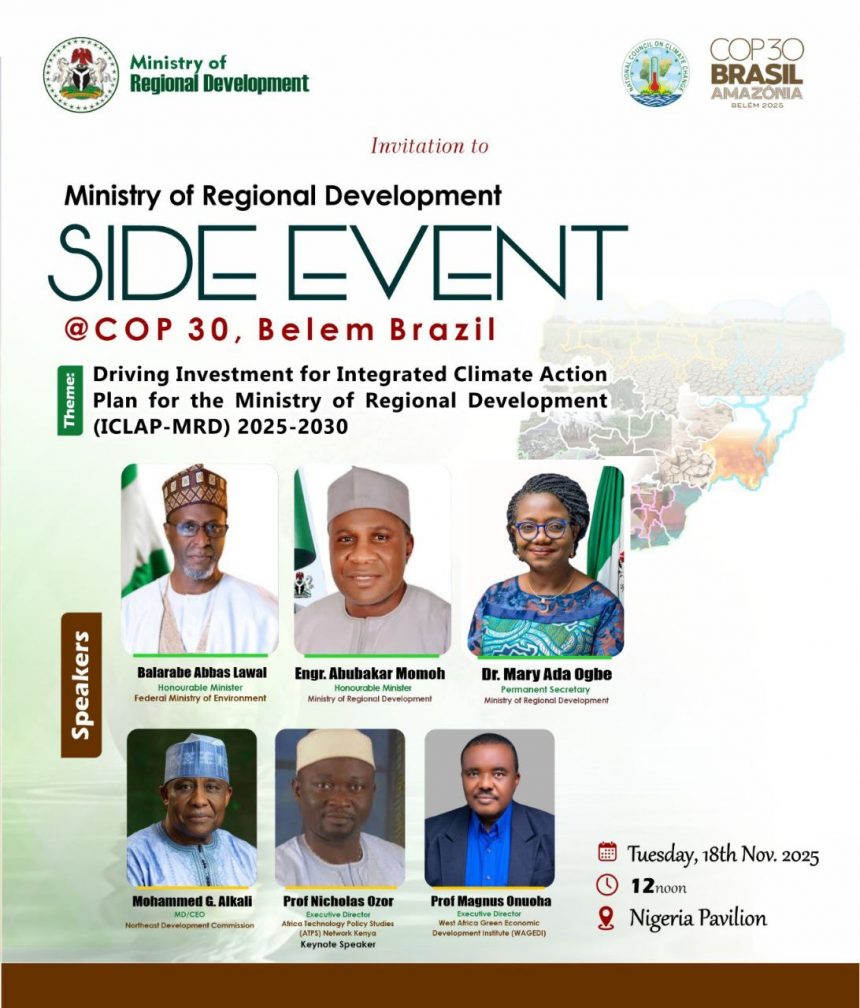Belém, Brazil – Nigeria is set to take centre stage at the COP30 conference, as Honourable Minister of Regional Development, Engr. Abubakar Momoh FNSE, hosts a high-level side event on Tuesday, 18th November 2025. The event, themed “Driving Investment for the Integrated Climate Action Plan (ICLAP-MRD) 2025–2030,” will showcase Nigeria’s commitment to climate-resilient regional development and attract global partnerships.
