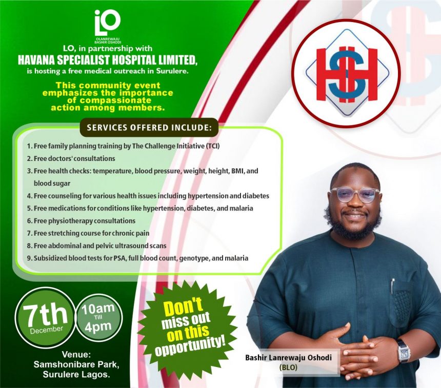 Lagos politician, Olanrewaju Bashir Oshodi will on Saturday, December 7, 2024, begin free medical outreach for residents of Surulere.