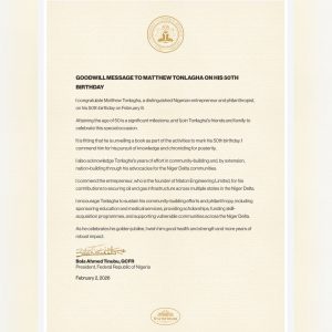 In a goodwill message personally signed by the President, he commended Tonlagha’s efforts in securing oil and gas infrastructure in the Niger Delta and his philanthropic work, including sponsoring education, medical services and other humanitarian activities across the country.