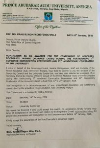 According to the letter of nomination addressed to the philanthropist of repute and cited by our correspondent in Lokoja, confirmed that the conferment ceremony will take place on the 24 January, 2026, at 10:00 am in the University Auditorium in Anyigba, Kogi State.
